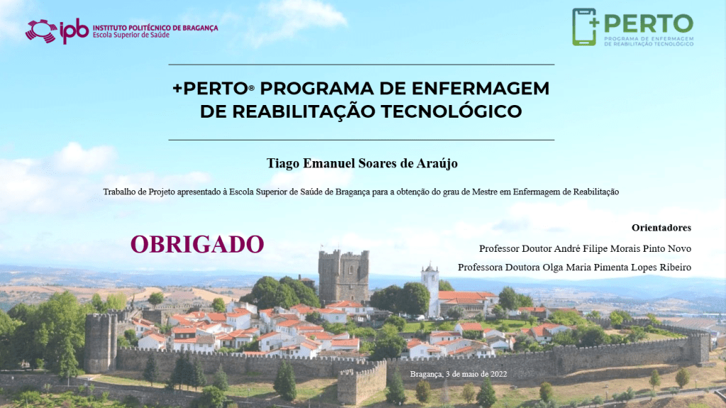 O +Perto® Programa de Enfermagem de Reabilitação Tecnológico foi apresentado sob a forma de trabalho de projeto à Escola Superior de Saúde de Bragança para a obtenção do grau de Mestre em Enfermagem de Reabilitação do Enfermeiro Tiago Araújo com a orientação do Prof. Dr. André Novo (Docente da Escola Superior de Saúde de Bragança) e da Prof. Drª. Olga Ribeiro (Docente da Escola Superior de Enfermagem do Porto).