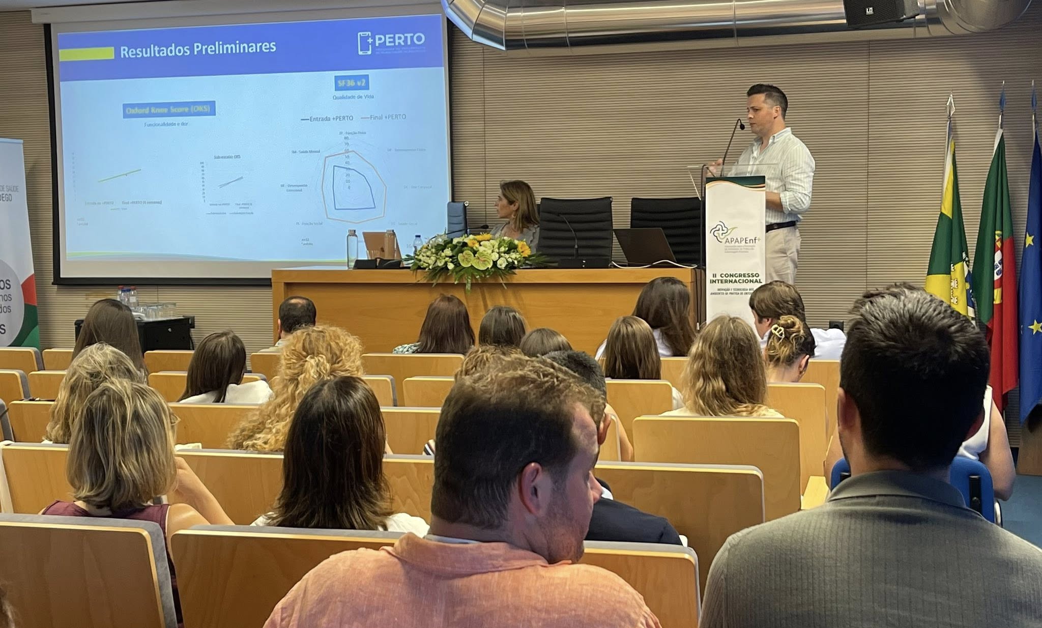 O Enfermeiro Tiago Araújo integrou o Painel II – “Integração de tecnologias nos ambientes de prática de enfermagem”, onde apresentou o +PERTO®, um programa de Enfermagem de Reabilitação tecnológico desenvolvido para apoiar pessoas submetidas a artroplastia total do joelho.