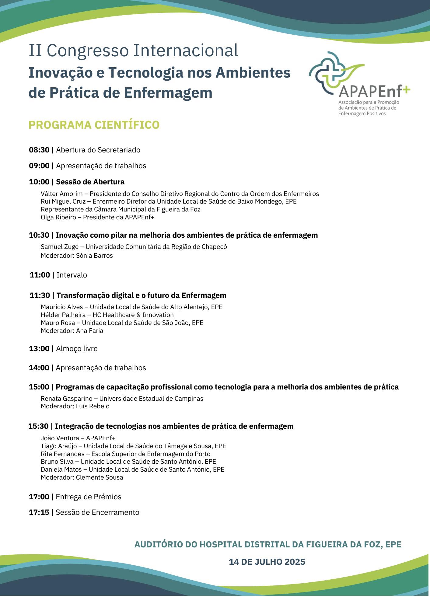 No dia 14 de julho de 2025, o enfermeiro Tiago Araújo participou no II Congresso Internacional “Inovação e Tecnologia nos Ambientes de Prática de Enfermagem”, promovido pela APAPEnf+ – Associação para a Promoção de Ambientes de Prática de Enfermagem Positivos, que decorreu no Auditório do Hospital Distrital da Figueira da Foz.
