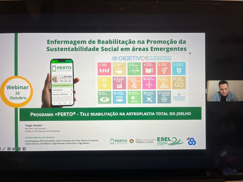 Destacou-se a participação do Enfermeiro Tiago Araújo, que apresentou o “Programa +PERTO – Tele Reabilitação na Artroplastia Total do Joelho”. Este programa inovador tem como objetivo oferecer soluções de tele-reabilitação a pacientes submetidos a artroplastias totais do joelho, promovendo assim o acesso a cuidados de qualidade e contribuindo para a sustentabilidade social na área da saúde.