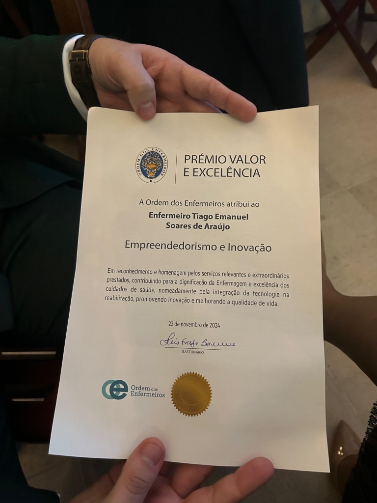 O prémio, entregue pelo Bastonário da Ordem dos Enfermeiros, Luís Filipe Barreira, destaca os serviços relevantes e extraordinários prestados pelo Enfermeiro Tiago Araújo, que contribuíram para a dignificação da profissão e para a excelência nos cuidados de saúde. A integração da tecnologia na reabilitação, promovendo a inovação e melhorando a qualidade de vida dos utentes, foi um dos pilares que justificaram este reconhecimento.