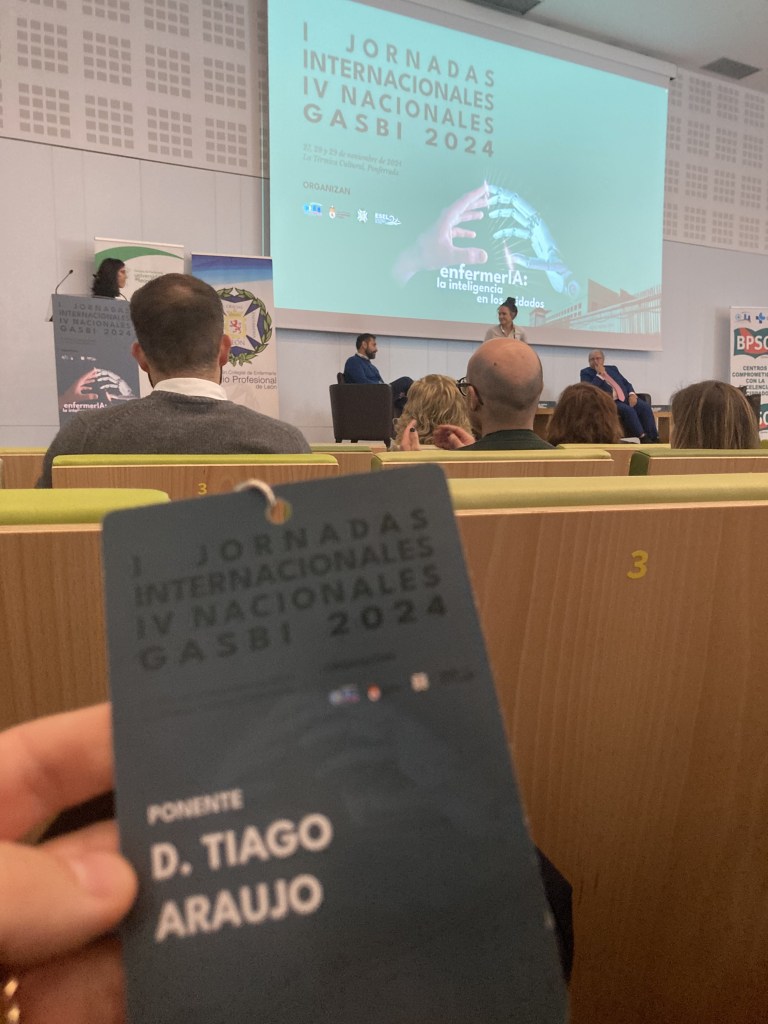O Enfermeiro Tiago Araújo integrou o Painel II – “Integração de tecnologias nos ambientes de prática de enfermagem”, onde apresentou o +PERTO®, um programa de Enfermagem de Reabilitação tecnológico desenvolvido para apoiar pessoas submetidas a artroplastia total do joelho.