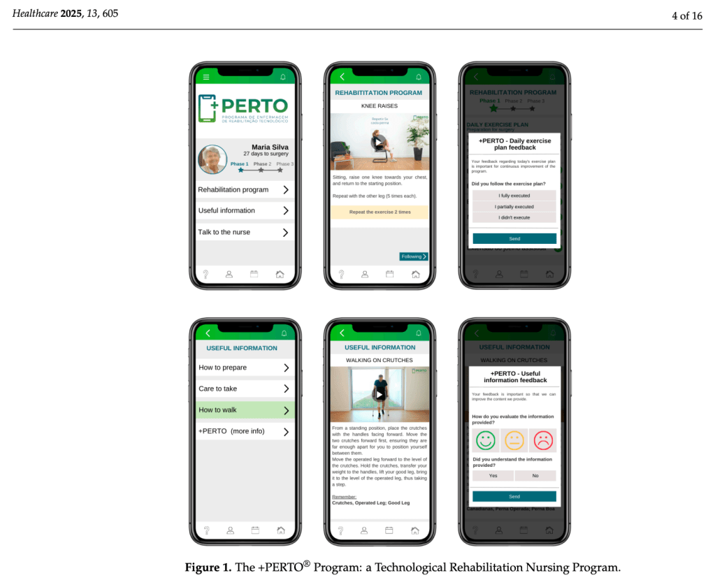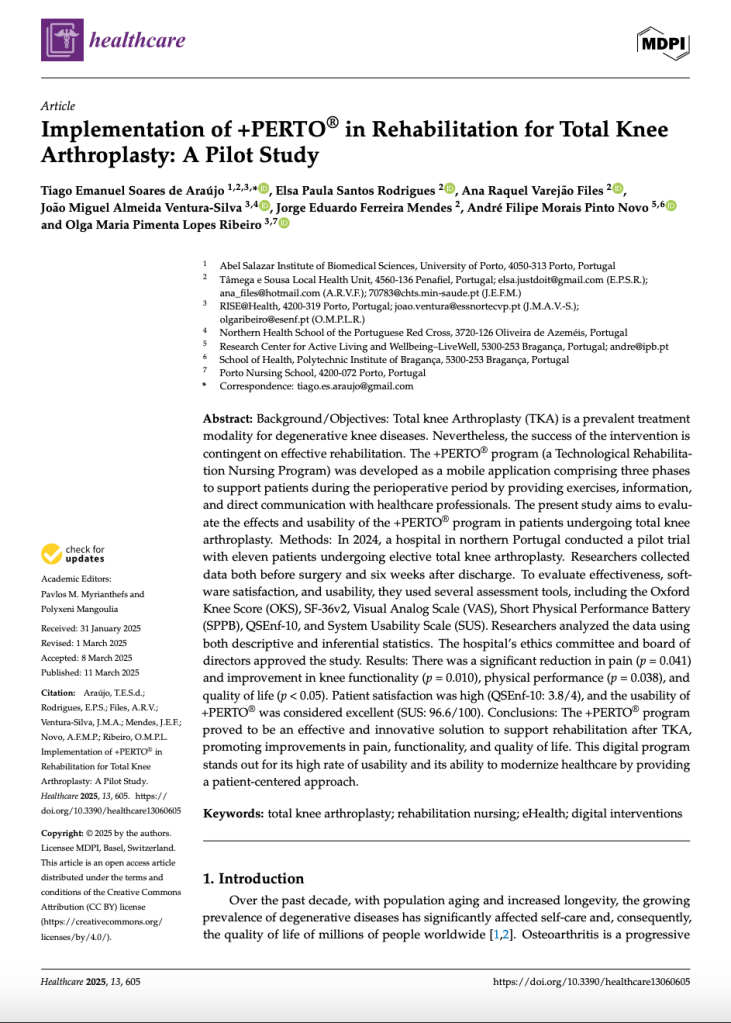 O +PERTO® é um programa digital criado para acompanhar e reabilitar pessoas submetidas a artroplastia total do joelho, antes, durante e depois da cirurgia, através de aplicação móvel. A intervenção alia tecnologia de ponta com o toque humano característico da enfermagem: presença, escuta ativa e apoio contínuo, mesmo à distância.