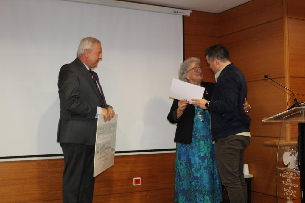 Tiago Araújo recebe o prémio das mãos da Professora Arminda Mendes Costa e do Presidente do Conselho de Administração da ULSTS Dr. José Luís Gaspar.