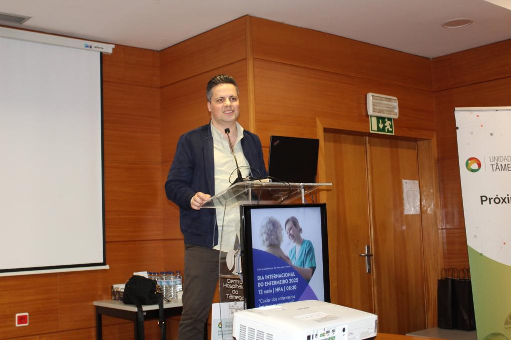 Na parte da tarde, o destaque foi a partilha de diversos projetos de sucesso, entre os quais se incluiu o Programa +PERTO, apresentado pelo Enfermeiro Especialista Tiago Araújo. O +PERTO, um projeto de enfermagem de reabilitação tecnológica, tem como principal objetivo proporcionar um acompanhamento contínuo e personalizado a pacientes submetidos a artroplastia total do joelho, utilizando uma aplicação móvel.