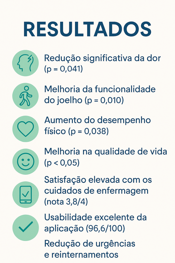 Neste estudo piloto, foram avaliados 11 pacientes submetidos a artroplastia total do joelho que utilizaram a aplicação móvel +PERTO®. Os resultados destacam-se positivamente, evidenciando: